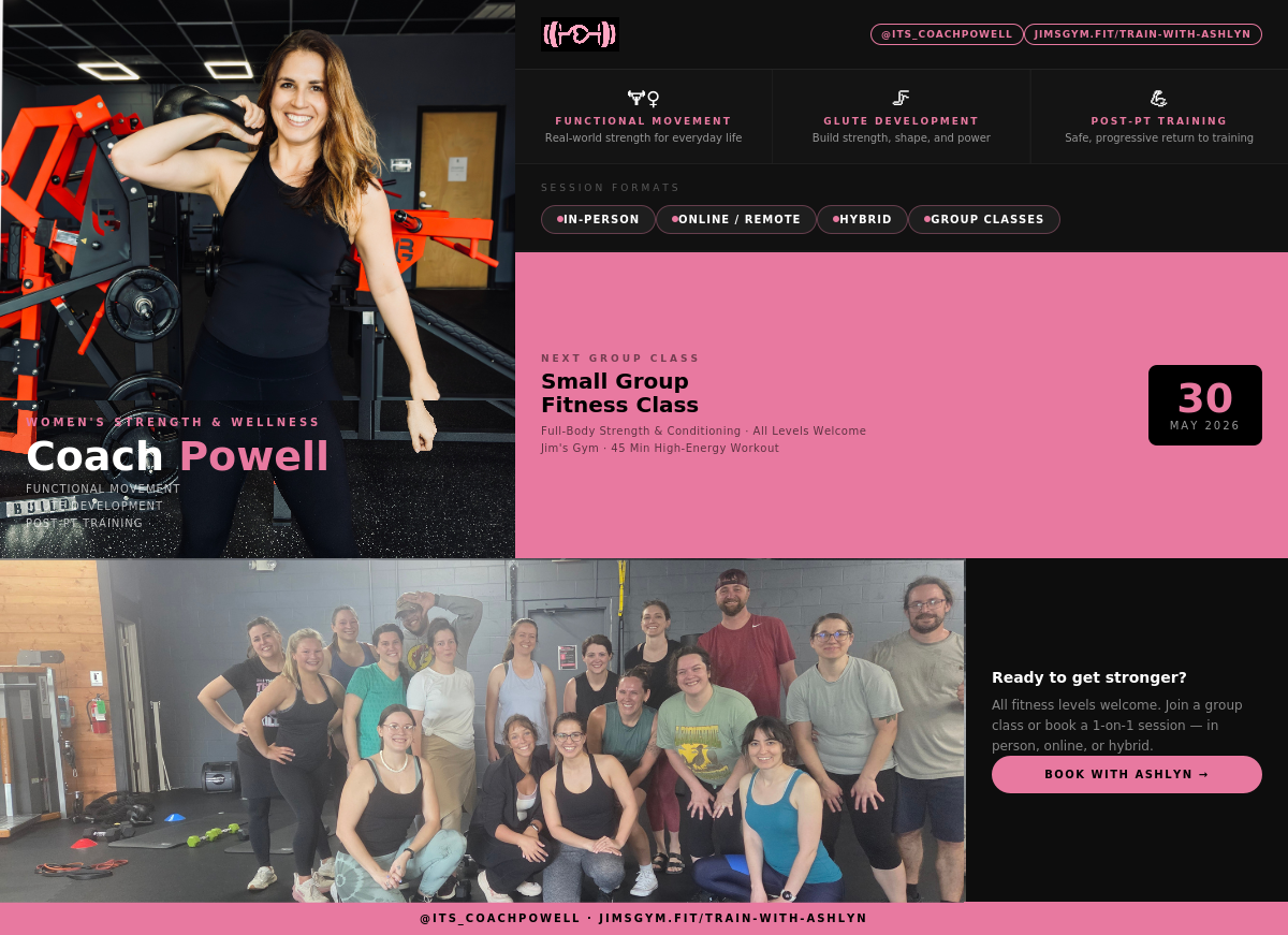 Now, she’s passionate about helping others build strength, confidence, and lasting change. She offers strength & conditioning, functional training, glute development, post-rehab training, and more—available in-person, online, or hybrid. Join her next Small Group Fitness Class on May 30 at Jim’s Gym for a high-energy, all-levels workout!